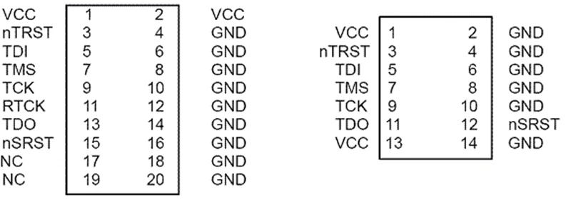 嵌入式系统中常用的20pin和10pin JTAG的信号排列如下: